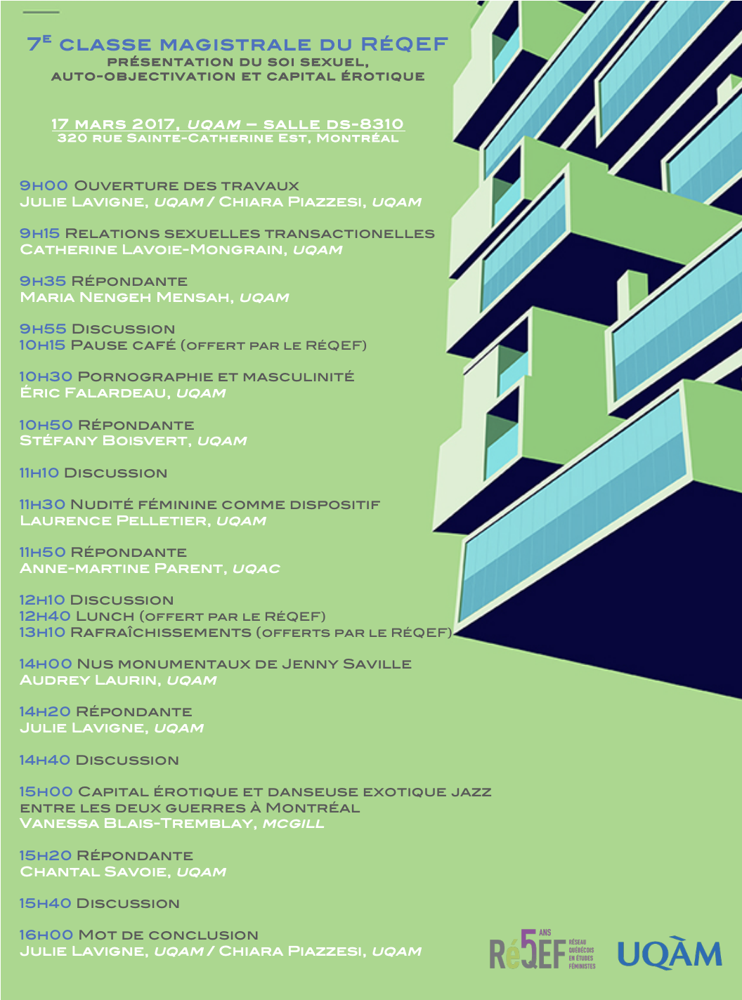 Organisée par nos membres Chiara Piazzesi (Sociologie, UQAM) et Julie Lavigne (Sexologie, UQAM), cette 7e classe magistrale intitulée « Présentation du soi sexuel, auto-objectivation et capital érotique » s’est déroulée le 17 mars 2017 à l’UQAM. Notre membre Anne-Martine Parent (arts et lettres, UQAC) a également contribué à l’activité.