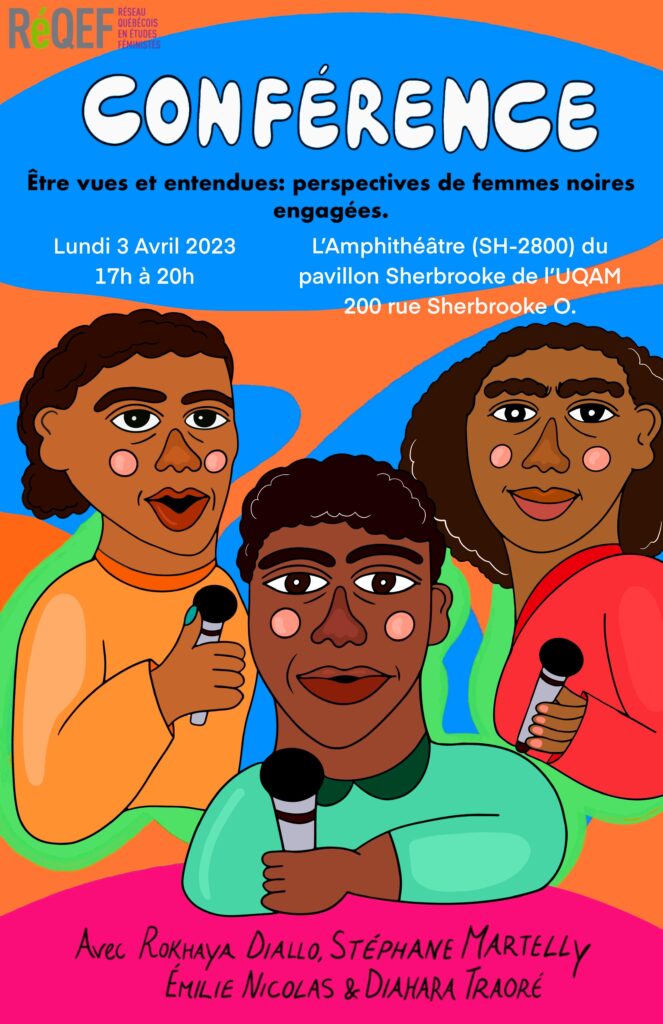 Le Réseau québécois en études féministes organisait la discussion « Être vues et entendues : perspectives de femmes noires engagées » en compagnie de Rokhaya Diallo, Stéphane Martelly, Émilie Nicolas et Diahara Traoré. Ensemble, elles ont discuté des enjeux de visibilité du travail des femmes noires dans les médias, la littérature et le milieu universitaire. La discussion était suivie d’un échange avec le public. L’événement était gratuit et avait lieu le lundi 3 avril 2023, de 17h à 20h, à l'Amphithéâtre (SH-2800) du pavillon Sherbrooke de l'UQAM. (suite…)