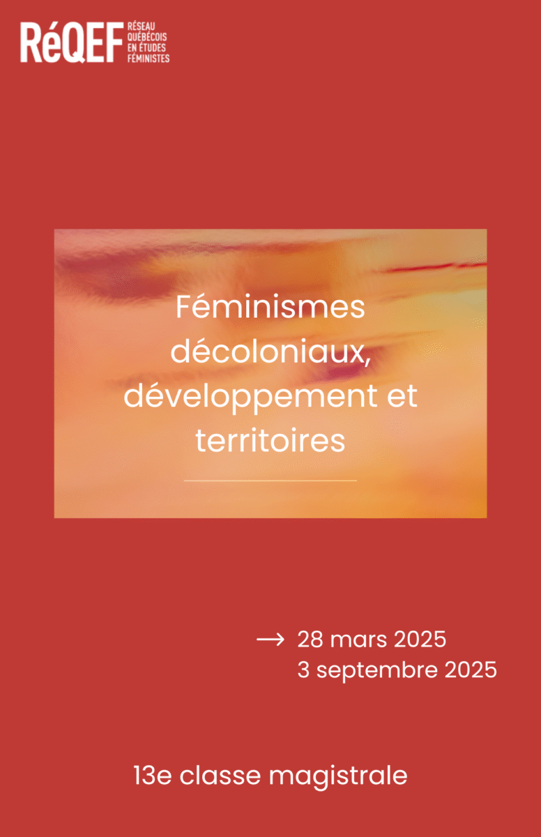 La classe magistrale « Féminismes décoloniaux, développement et territoires » est pensée en deux volet, un premier qui a eu lieu le 28 mars 2025 de 8h30 – 16h30, à UQAM (en présentiel et sur Zoom) et un second qui aura lieu le 3 septembre 2025, en ligne.