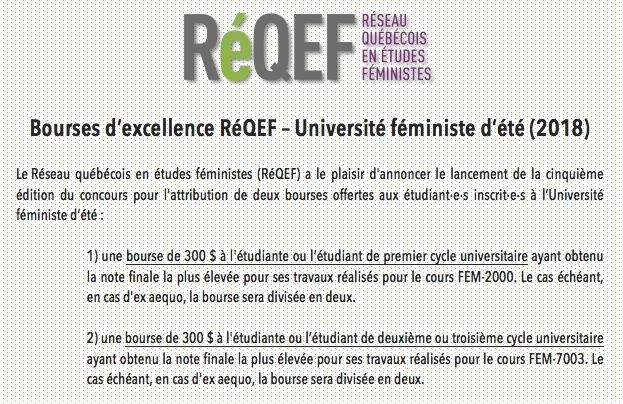 Le Réseau québécois en études féministes (RéQEF) a le plaisir d’annoncer le lancement de la cinquième édition du concours pour l’attribution de deux bourses offertes aux étudiant·e·s inscrit·e·s à l’Université féministe d’été de l’Université Laval :