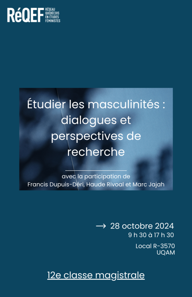 Cette 12ème classe magistrale du RéQEF porte sur les enjeux théoriques et méthodologiques de l’usage du concept de « masculinités » en sciences humaines et sociales. Cette journée visait à explorer les multiples dimensions des masculinités, en mettant en lumière les réflexions contemporaines sur ce que signifie être un homme dans des contextes sociaux et historiques variés (au travail, dans la société ou en ligne) ainsi que la manière dont sont mobilisés les différents discours contemporains sur la masculinité. À travers une table ronde où seront convié.e.s trois chercheur.se.s spécialisé.e.s sur ces questions, il s’agira de rendre compte des complexités inhérentes à... En savoir plus →