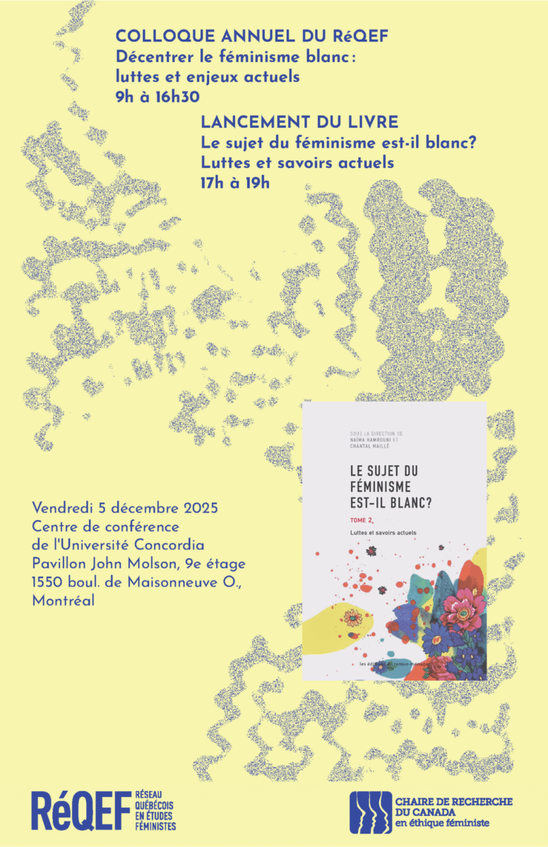 Le vendredi 5 décembre 2025 avait lieu le colloque annuel du RéQEF, en collaboration avec la Chaire de recherche du Canada en éthique féministe, intitulé « Décentrer le féminisme blanc : luttes et enjeux actuels », de 9 h à 16 h 30, au Centre des conférences de l’Université Concordia, Pavillon John Molson School of Business – JMSB (1450 rue Guy – 9e étage, Métro Guy-Concordia). Suite au colloque, le lancement de l’ouvrage Le sujet du féminisme est-il blanc? Luttes et savoirs actuels – tome 2, dirigé par Chantal Maillé (co-directrice du RéQEF et ISdB, Concordia) et Naïma Hamrouni (philosophie, UQTR), et qui a inspiré l’idéation de ce colloque, se tenait au même endroit de 17 h à 19 h sous forme d’un coquetel festif !