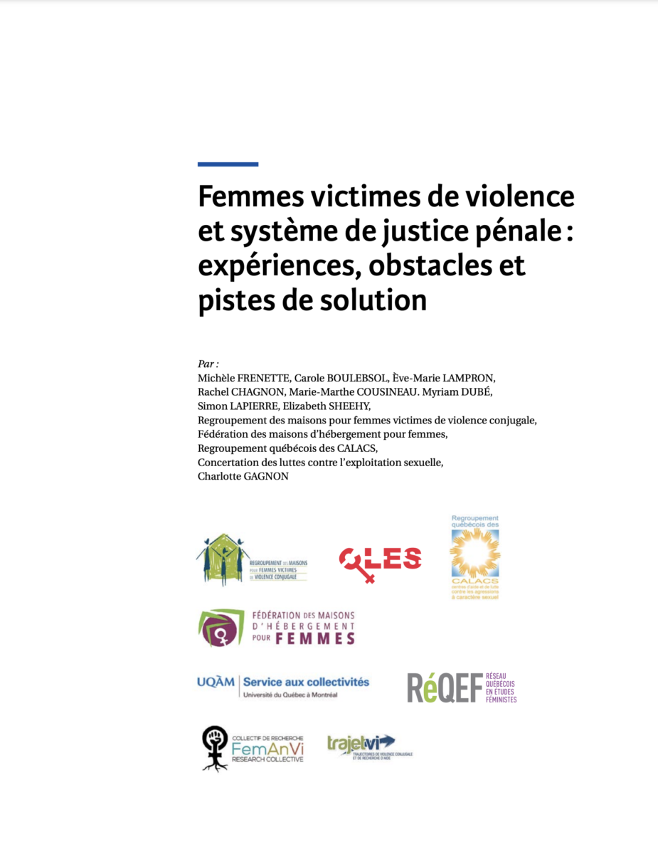Soutenu par le RéQEF, le rapport « Femmes victimes de violence et système de justice pénale : expériences, obstacles et pistes de solution » est disponible. Il a été produit par nos membres Carole Boulebsol (travail social, UQAM), Ève-Marie Lampron (histoire, UQM), Rachel Chagnon (sciences juridiques, UQAM), Marie-Marthe Cousineau (criminologie, U. de M.) ainsi que Simon Lapierre (travail social, U. Ottawa).