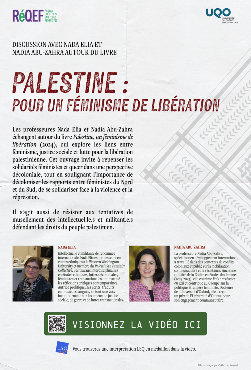 Le 26 février 2025, dans le cadre des activités organisées par l’Antenne UQO du RéQEF et à l’initiative des professeures Audrey Rousseau (sciences sociales, UQO), Carole Boulebsol (sciences sociales, UQO) et Leila Benhadjoudja (uOttawa), une discussion entre les professeures Nada Elia de la Western Washington University et Nadia Abu-Zarha de l’Université d’Ottawa a été organisée et enregistrée autour du livre “Palestine, pour un féminisme de libération” (2024) de Nada Elia.