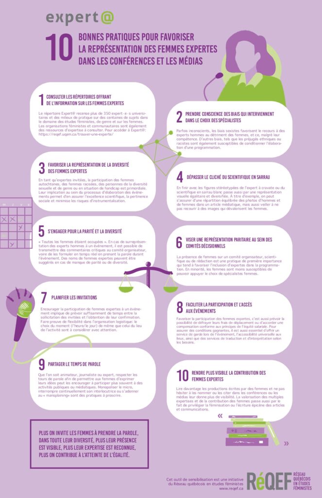 Quand les experts masculins sont surreprésentés dans des conférences ou des médias, cela contribue à perpétuer des inégalités de genre et un biais négatif envers les expertes femmes, particulièrement celles issues de la diversité. Fidèle à sa mission de promouvoir les études féministes et dans l’effort de contribuer à favoriser la visibilité des femmes scientifiques et expertes, le RéQEF lance son guide des 10 bonnes pratiques pour favoriser la représentation des femmes expertes dans les conférences et les médias. Cet outil est téléchargeable gratuitement en cliquant sur l'image ci-bas. Un guide à consulter, à imprimer et à partager grandement ! Graphisme :... En savoir plus →
