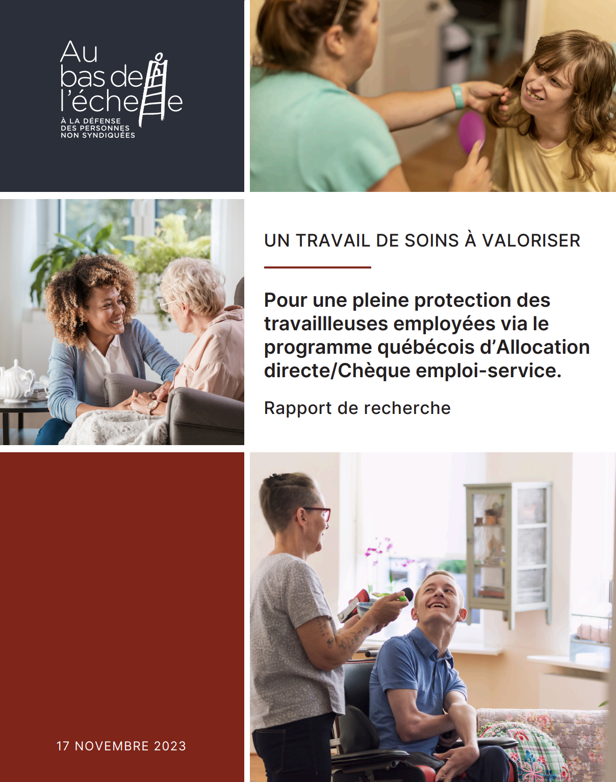 Louise Boivin (relations industrielles, UQO), Marie-Hélène Verville (relations industrielles, UQO) ainsi que Stéphanie Bernstein ont publié le rapport de recherche « Un travail de soins à valoriser. Pour une pleine protection des travailleuses employées via le programme québécois d’Allocation directe/Chèque emploi-service », en collaboration avec l’organisme Au bas de l’échelle.